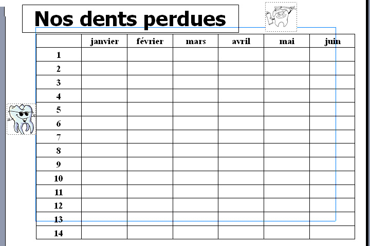 J'ai préparé un petit tableau pour noter chaque mois le nombre de dents perdues!!!Cela permet de travailler le tableau à double entrée et ils adorent! On note des barres sur une fiche à côté et chaque fin de mois un élève fait le bilan et complète le tableau.