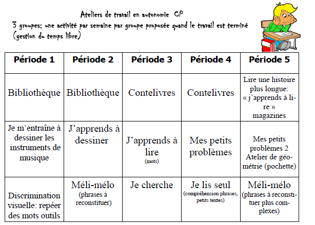 Je propose à mes élèves un atelier différent chaque semaine. Ma classe est divisée en 3 groupes, les mêmes toute l'année: 1-2-3 . Trois pictogrammes correspondants aux ateliers sont affichés au tableau avec en dessous le numéro du groupe inscrit à cette activité pour la semaine.